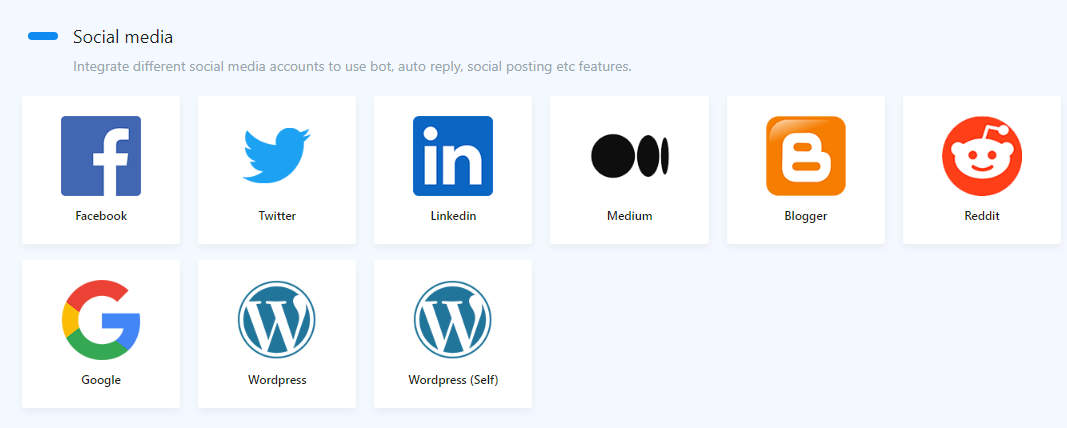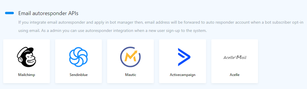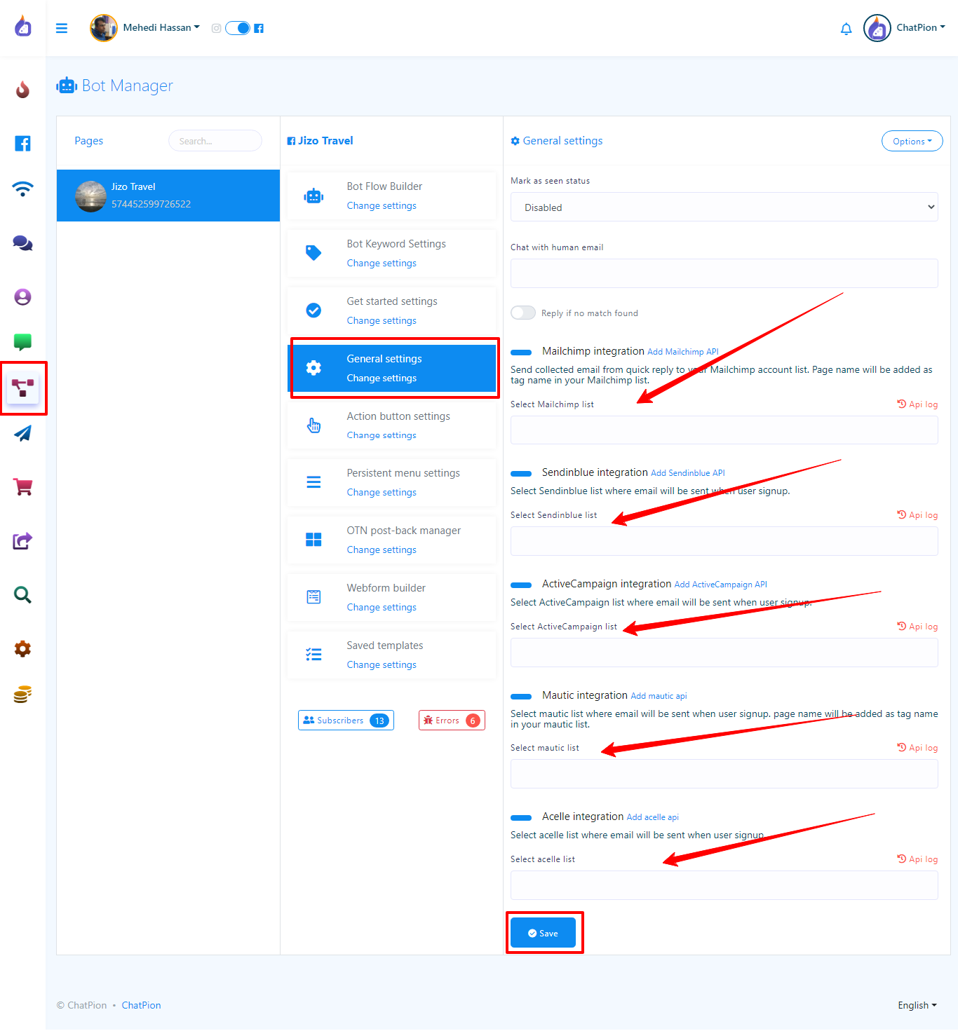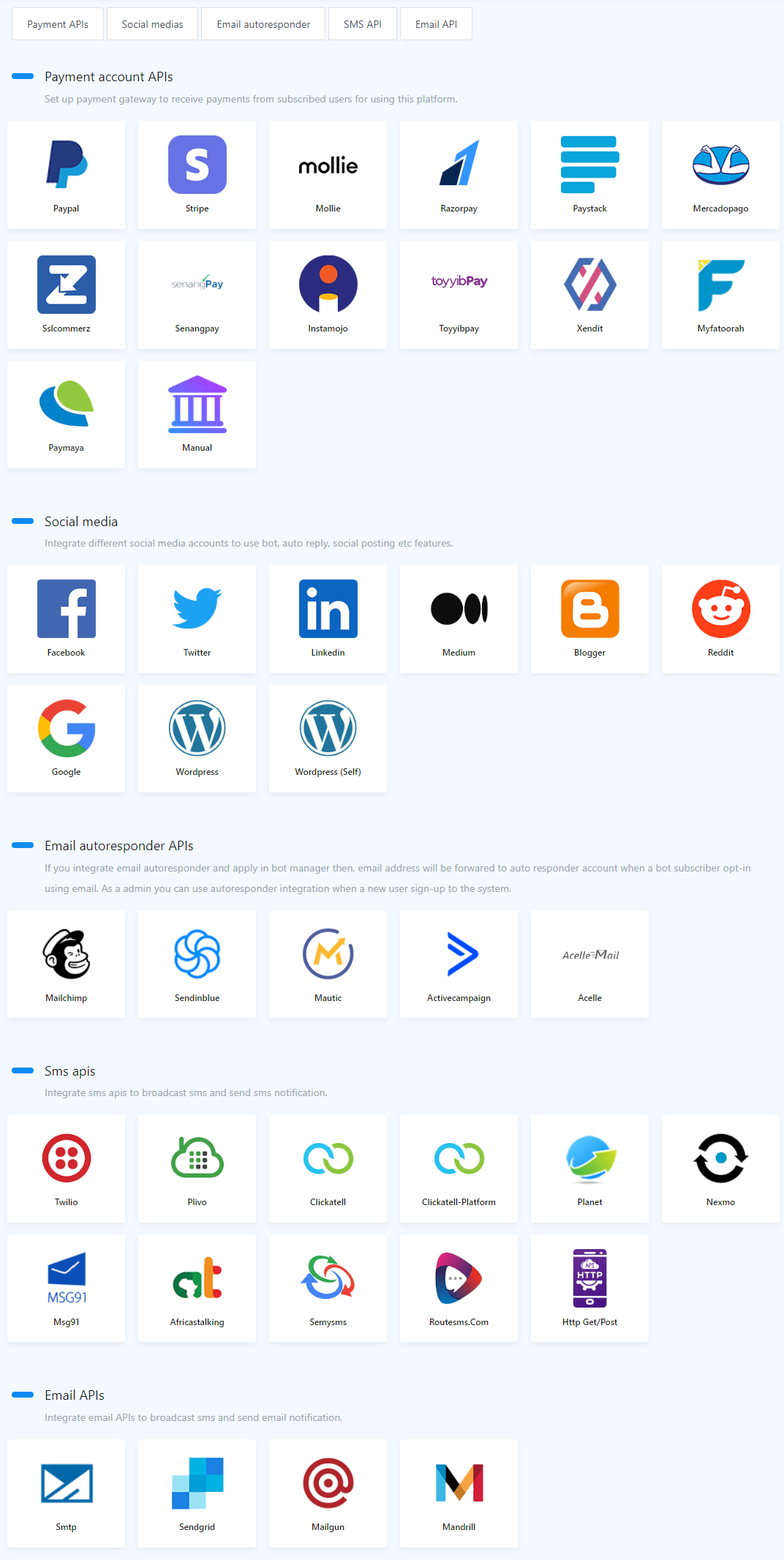 API Channels section has covered all of APIs settings in one section and One can explore shortly what types of APIs need to be set up to make ChatPion complete.