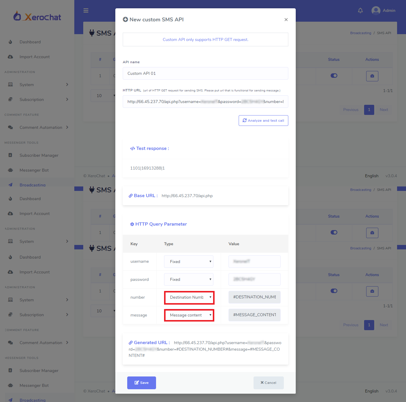 Fill the API name and HTTP/HTTPS URL fields. For the HTTP URL field please put url ( must be with http or https ) that is functional for sending message and must be for HTTP GET request.