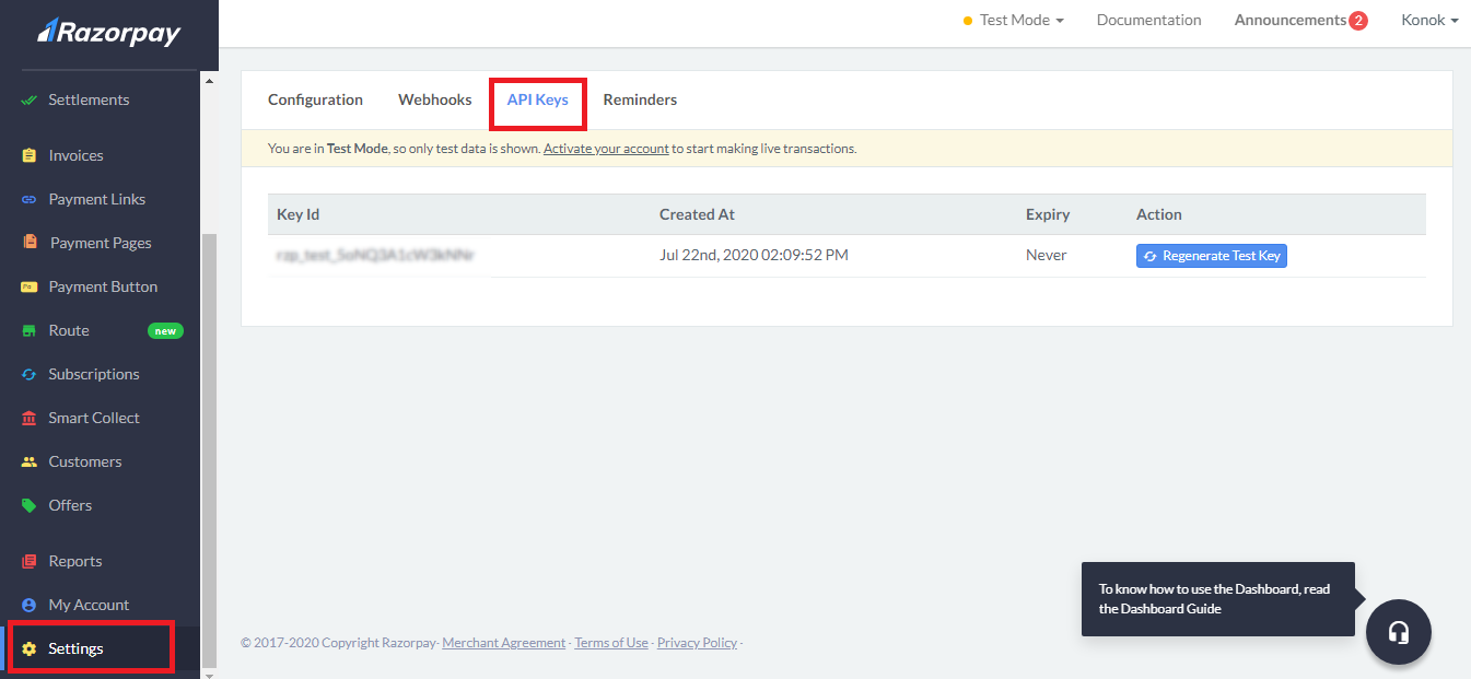 Razorpay Key ID & key secret: If you want to integrate Razorpay payment method then you’ve to put your razorpay key id and secret key. Visit Razorpay and go to Settings > API Keys and copy your key id and key secret and paste into the corresponding field.