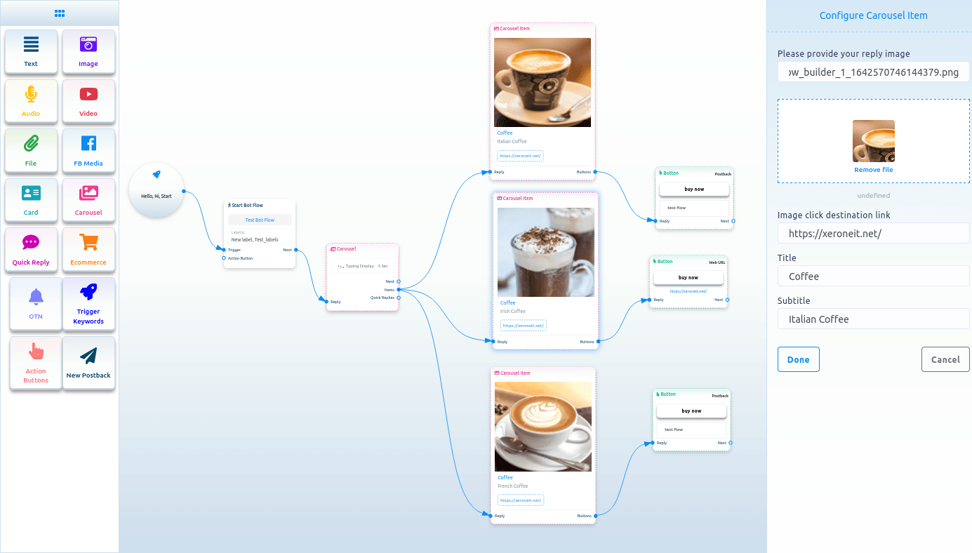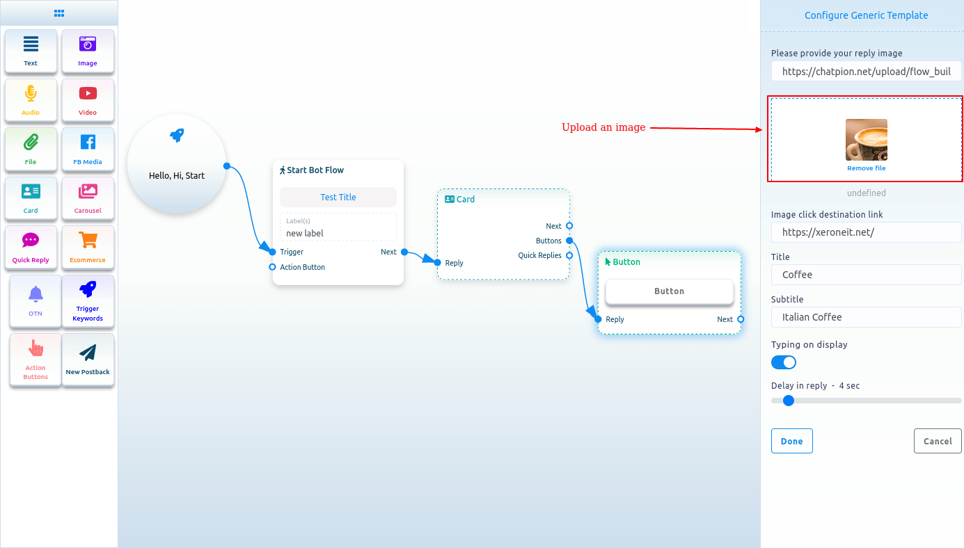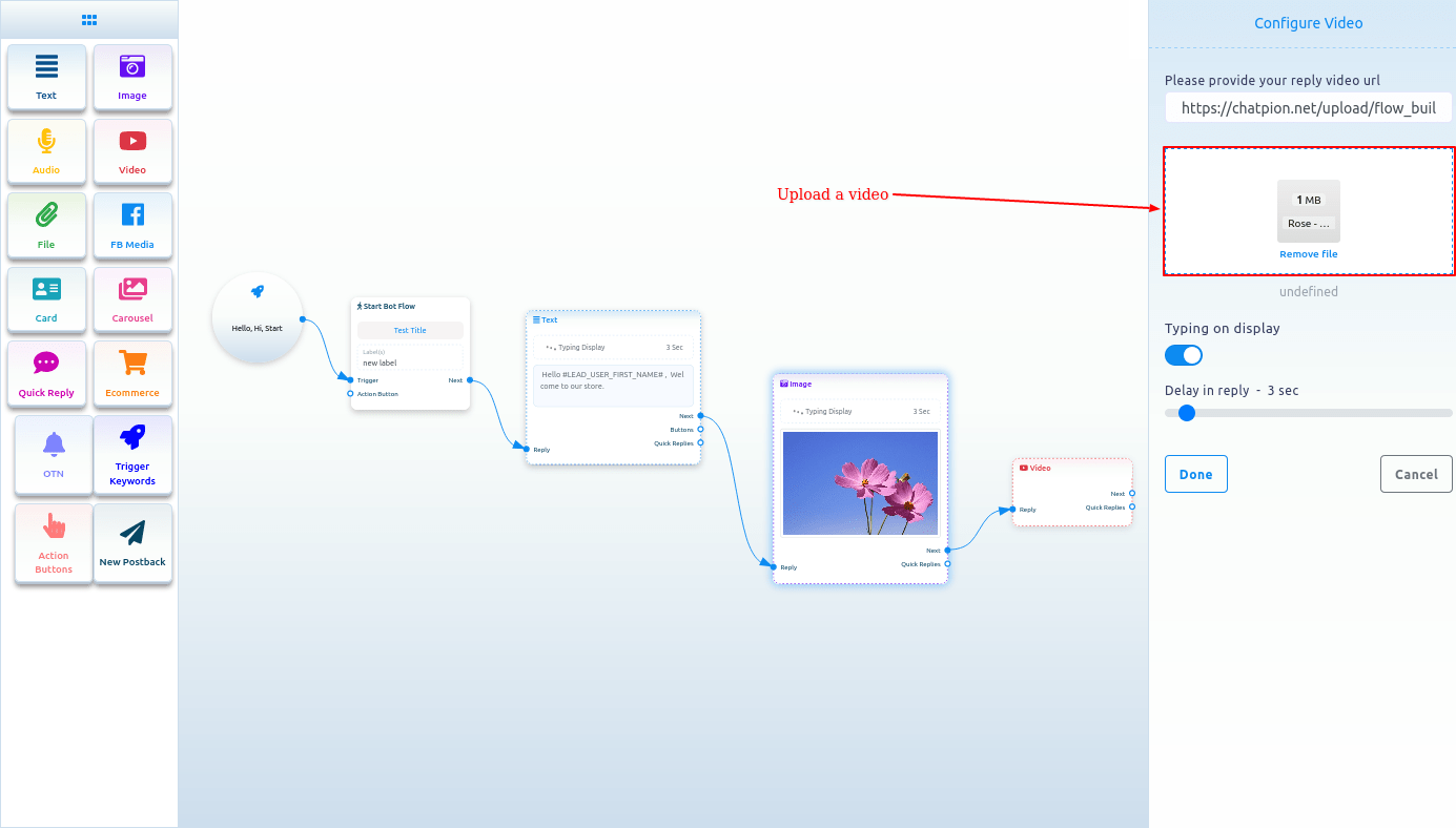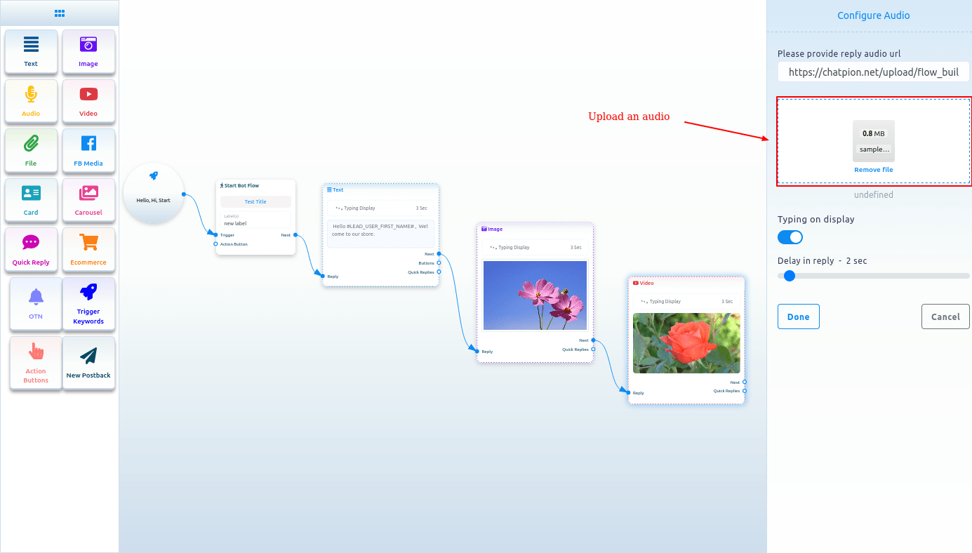 Likewise, you can add Image, Audio, Video, and File components. For these components, you have to upload an image, audio, video, and file respectively. Then you have to connect the components with other components.