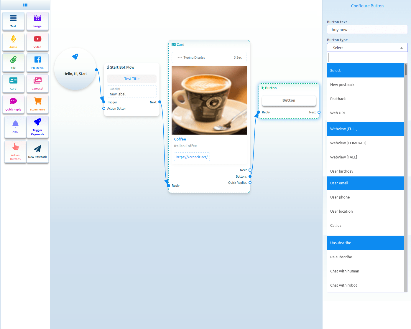 Now double-click on the button component and a right sidebar called configure button will appear. Now write a text in the button text field – the text will appear on the button. Then you have to select a button type from the button type field. Click on the button type field and a drop-down menu of different button types – New postback, postback, Weburl, Webview [full], Webview[compact], Webview[tall], User birthday, User email, User phone, User location, Call us, Unsubscribe, Re-subscribe, Chat with human and Chat with robot will appear.