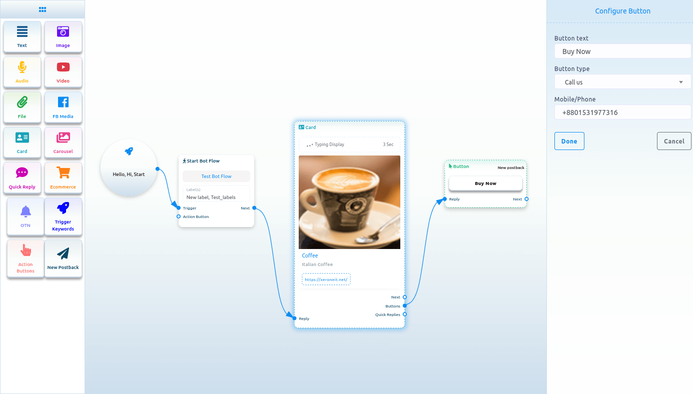 Now drag the trigger keywords element and drop it on the editor. Now double-click on the component and a sidebar called configure Trigger will appear. In the field, you have to provide comma-separated keywords. When a user writes one of the keywords, the bot will start. Also, you can select a matching type – Exact keyword match and String match. Then click on the Done button. And the keywords will appear on the component.