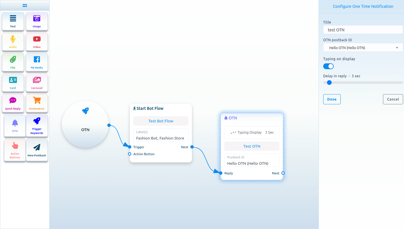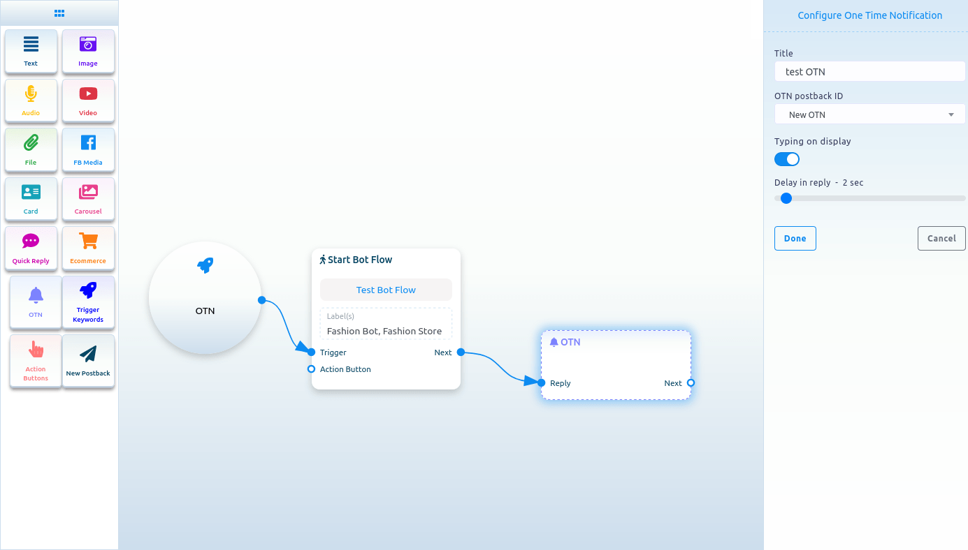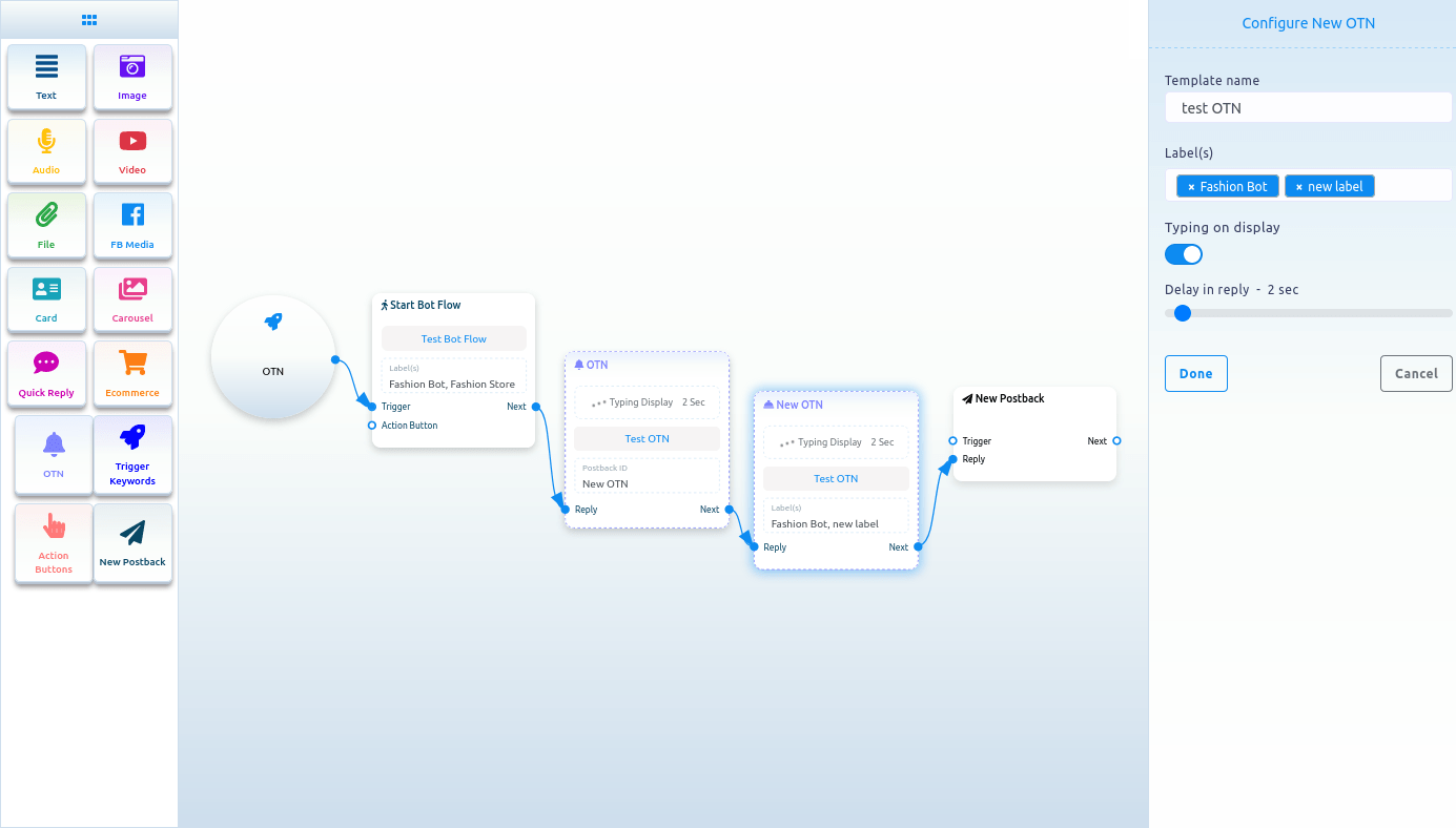 Now click on the New OTN component and a right sidebar called Configure New OTN will appear with some fields. Give a template name in the template name fields and choose labels in the labels field. You can enable typing on display and select a delay time in reply in seconds. Then click on the done button. And the information will appear on the New OTN template.