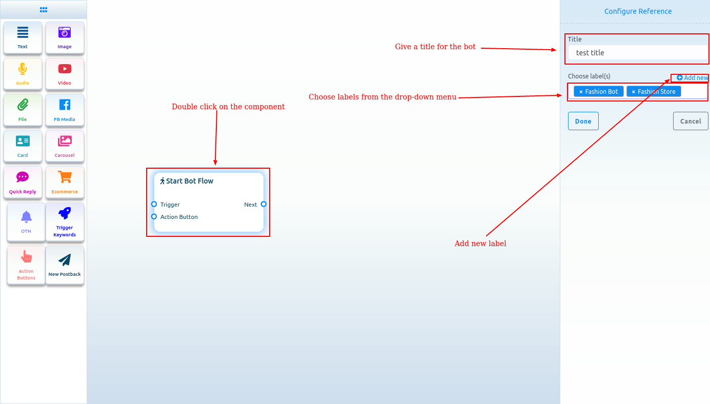 On the Editor, you will see an element called start bot flow. This component is essential to building the bot. Double-click on the Start bot Flow element and the Right Sidebar called Configure Reference will appear with two fields – Title and Choose Labels. In the title field, give a title for the bot.