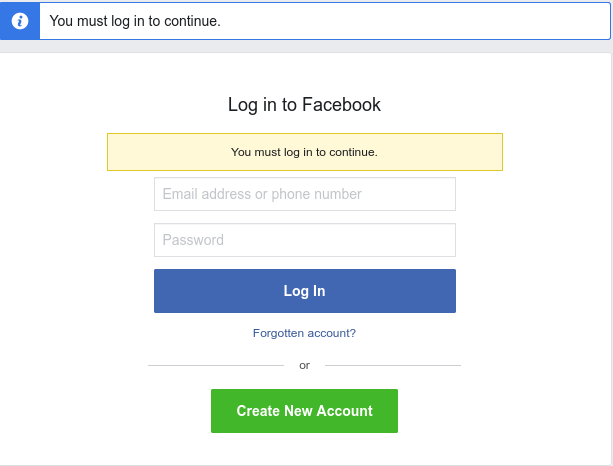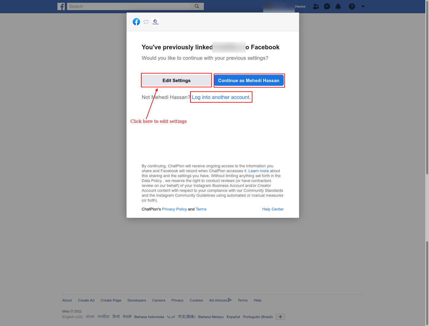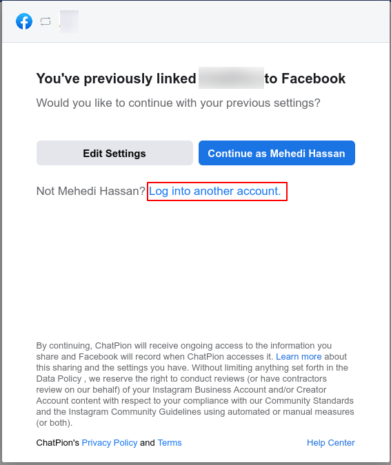 Instantly, a modal form will appear on Facebook with three buttons edit settings, continue as your profile name and log into another account.