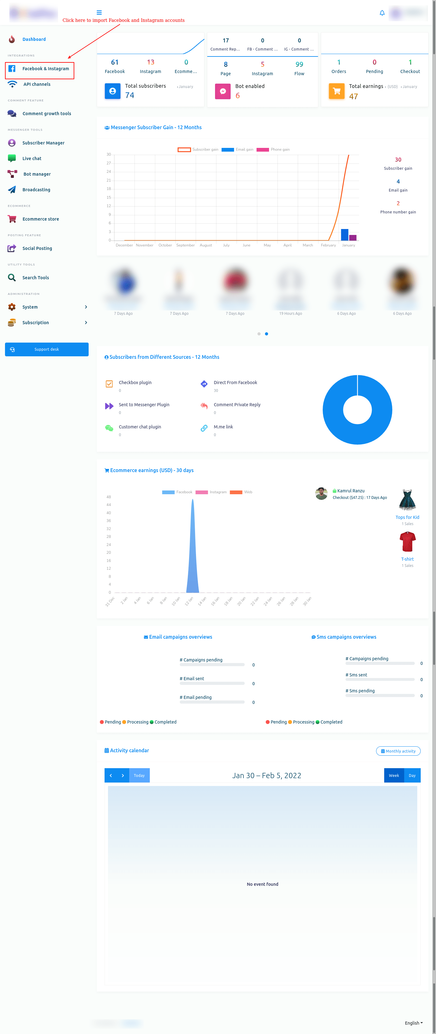 To import Facebook and Instagram accounts, first, go to the dashboard of ChatPion. At the left sidebar of the dashboard, you will see a menu called Facebook and Instagram. Click on the menu.