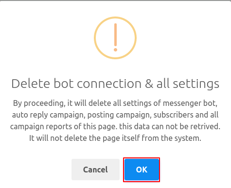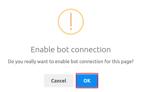 To re-start the bot connection, click on the radio button. Instantly, a modal will appear with Cancel and OK buttons. Click on the OK button and the bot will be restarted.