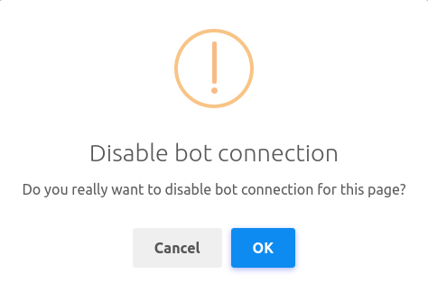 By clicking on the power button, you can disable the bot connection. Just as you click on the power button, a modal will appear with Cancel and OK buttons. Click on the OK button and the bot will be disabled.