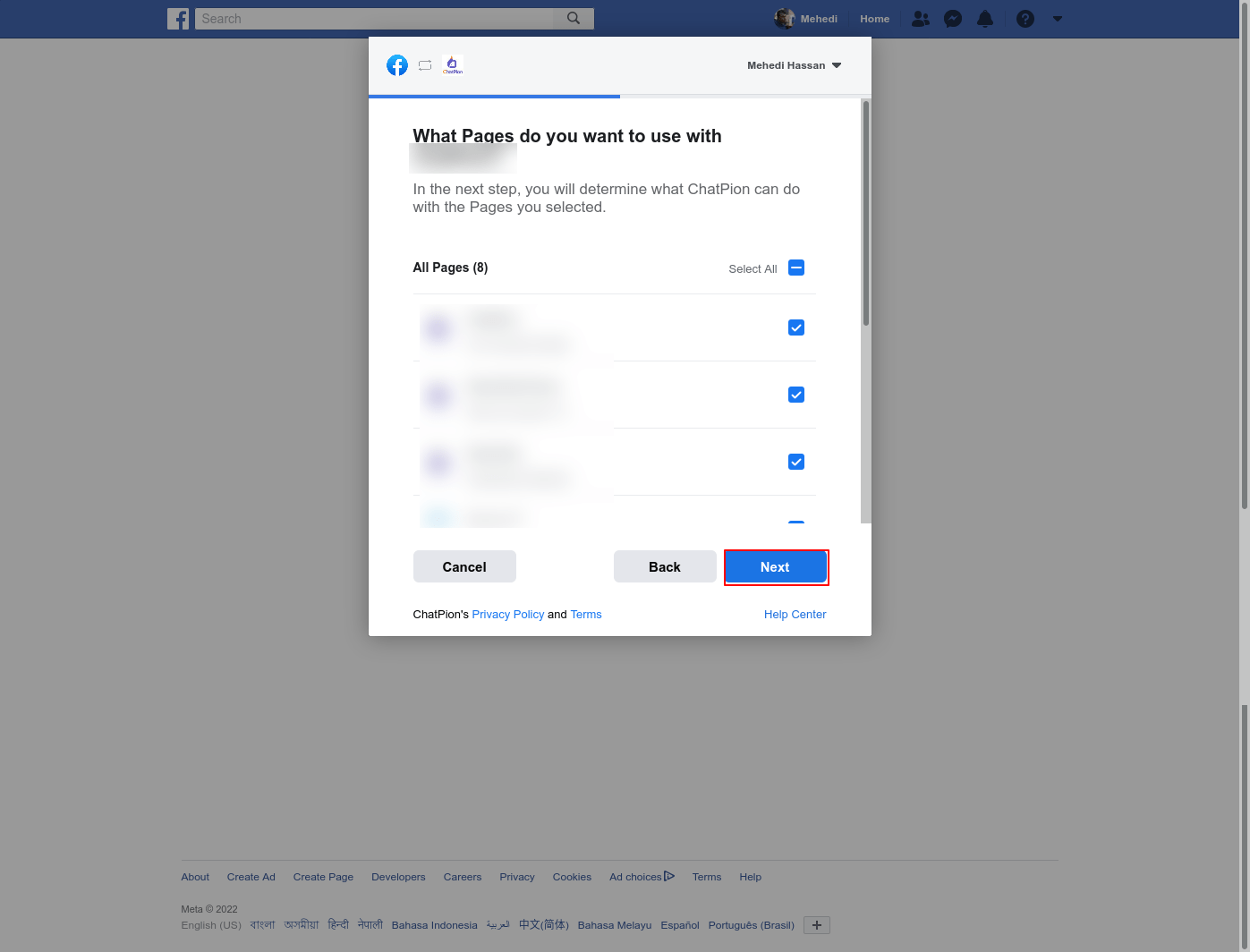 Instantly, another modal form will appear on the Facebook profile. On the modal form, you have to select the Facebook pages you want to use with ChatPion. Of course, you can select multiple or all Facebook pages.