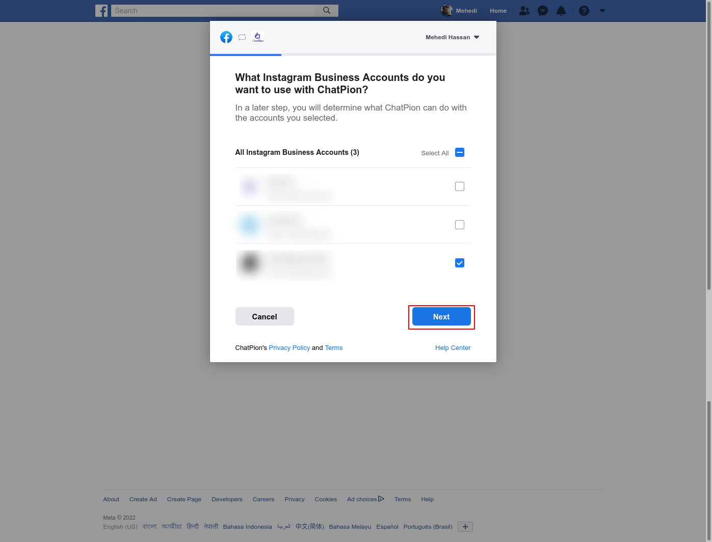 On the modal form, you have to select Instagram business accounts you want to use with ChatPion. Of course, you can select multiple or all Instagram business accounts.