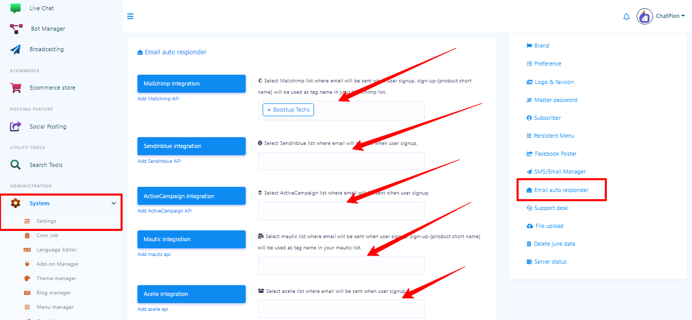 API Channels section has covered all of APIs settings in one section and One can explore shortly what types of APIs need to be set up to make ChatPion complete.