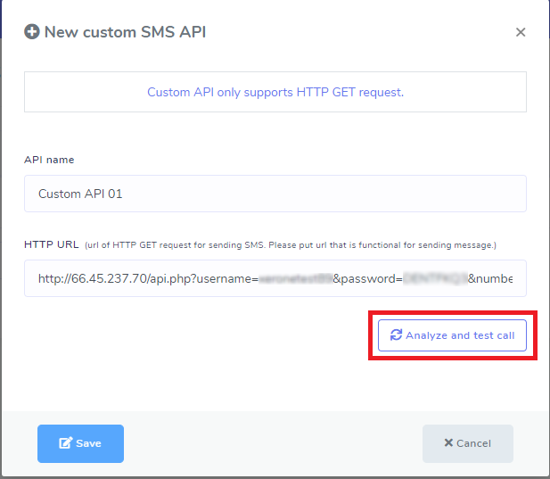 Fill the API name and HTTP/HTTPS URL fields. For the HTTP URL field please put url ( must be with http or https ) that is functional for sending message and must be for HTTP GET request.