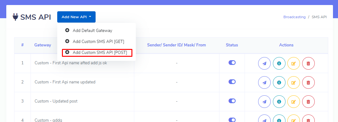Go to API Channels -> SMS API Section -> HTTP GET/Post option. You'll be redirected to the SMS API management section. Click on the Add SMS API -> Add Custom SMS API [POST]