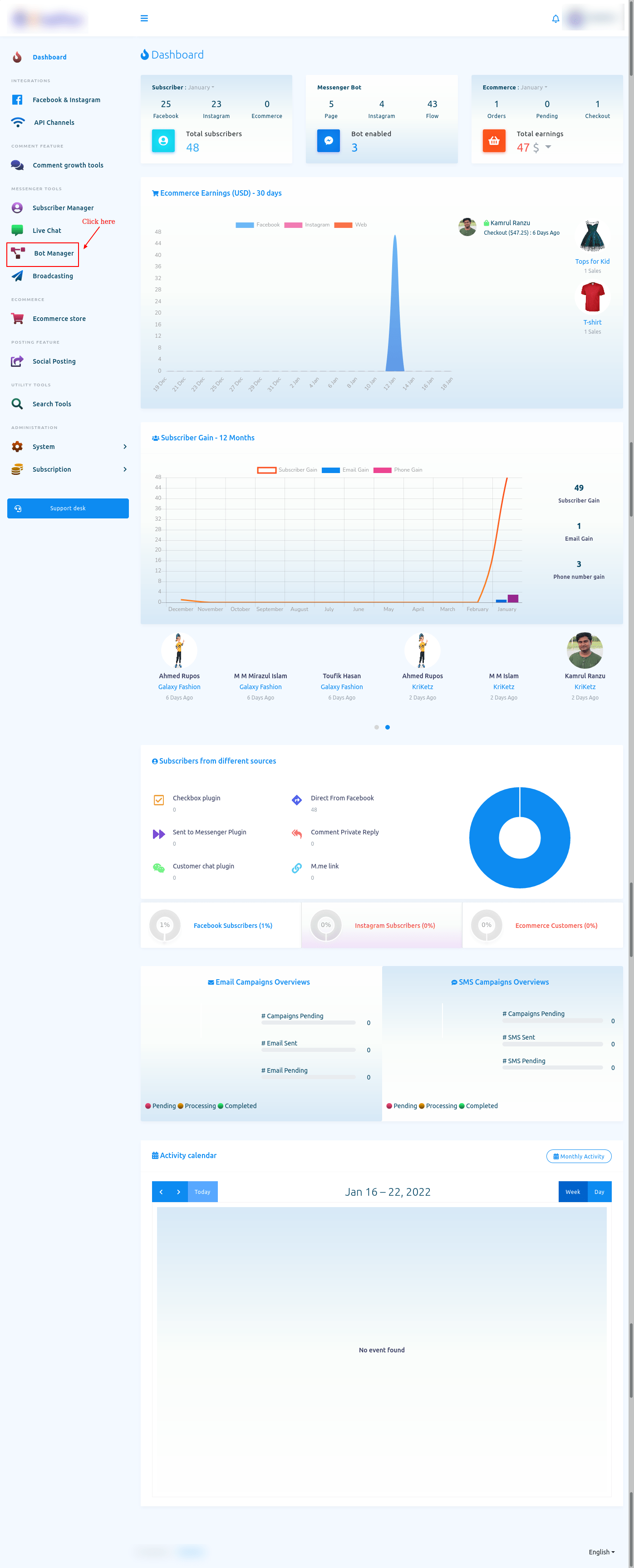 And instantly, the Bot Manager page will appear. At the top of the page, you will see the profile of your Facebook account. If you have imported one more Facebook Profile, you can change the Facebook profile.