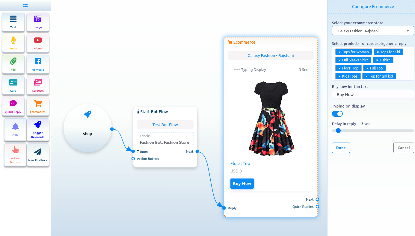 After you have selected a store, you have to select products for carousel/ generic reply. Just as click on the field, a drop-down menu of different products will appear. Now select products from the drop-down menu. Of course, you can select multiple products. Then you have to write text for the buy now button. Also, you can enable typing on display and select delay time in seconds. Now click on the done button.