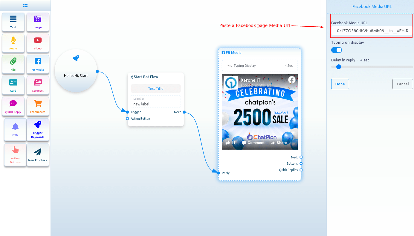 You can enable typing on display and select time in seconds for the delay in reply. Now click on the done button and the Facebook page media URL will appear on the component.