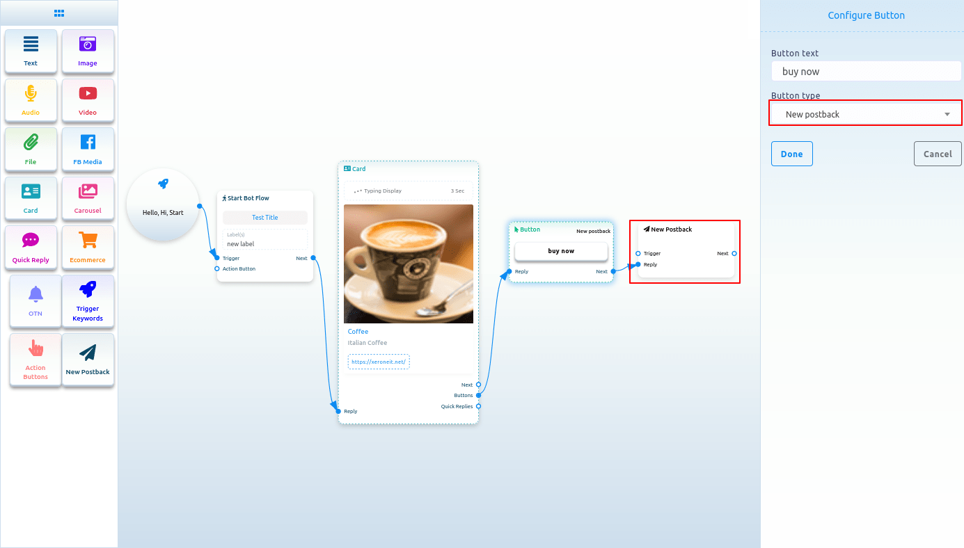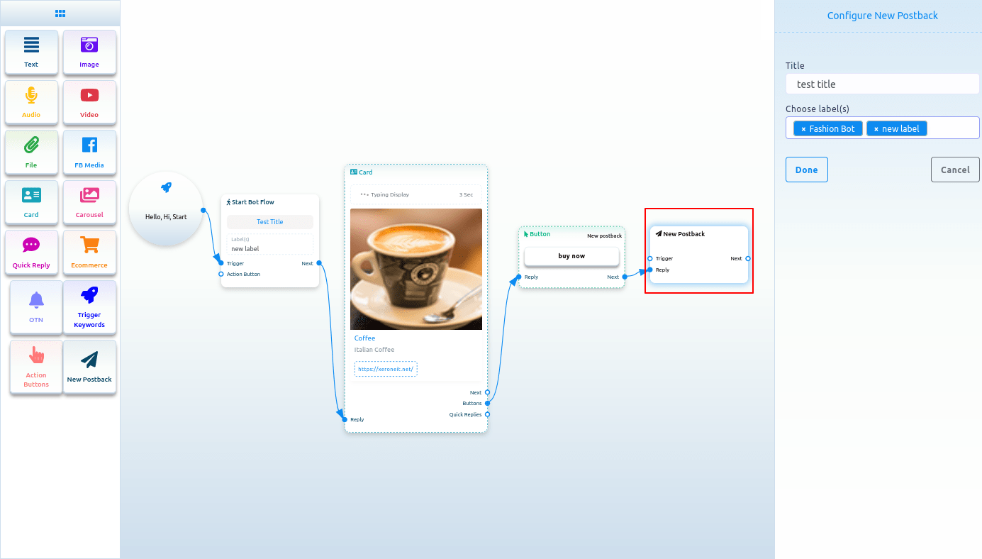 And instantly, a new postback button will appear connected with the Button component. Now double-click on the New postback Component and the right sidebar called configure New postback will appear. Give a title for the New postback in the title field. And select labels from the Choose label field. Now click on the Done button.
