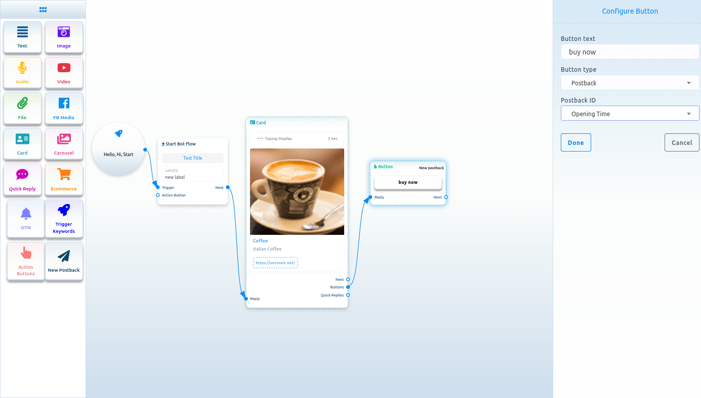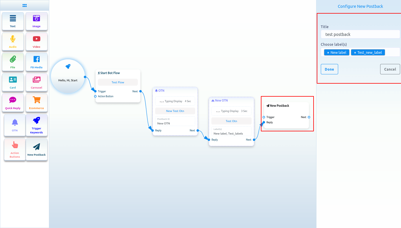Now click on the New postback Component and a right sidebar called configure new postback will appear with some fields. Give a title in the title field and choose labels in the Choose labels field. Now click on the done button. Now you have to connect a component with the new postback component. After that, click on the Save button and your bot with OTN will be saved.