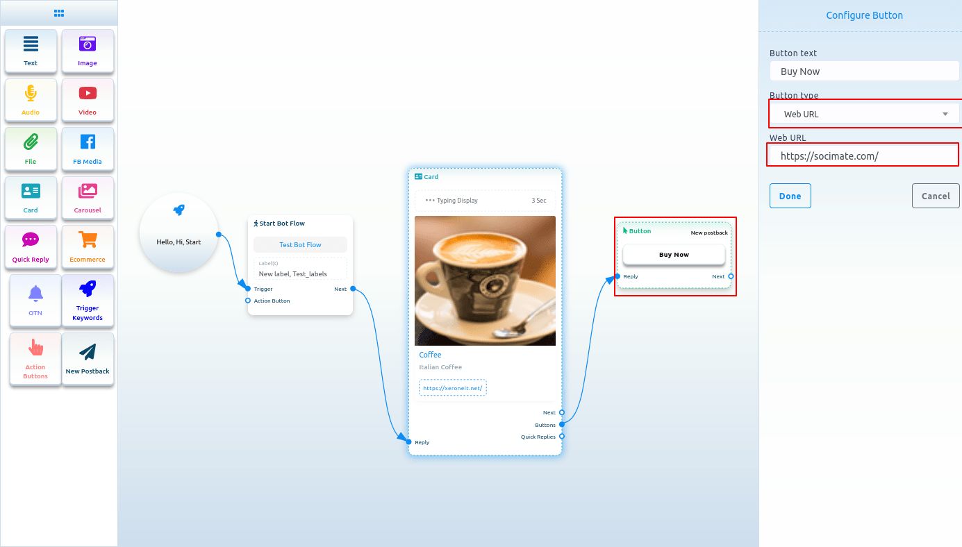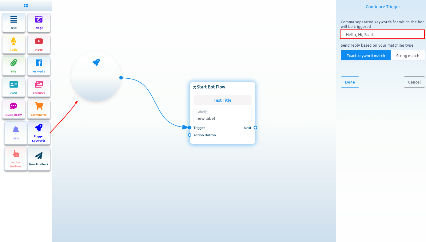 Now drag the trigger keywords element and drop it on the editor. Now double-click on the component and a sidebar called configure Trigger will appear. In the field, you have to provide comma-separated keywords. When a user writes one of the keywords, the bot will start. Also, you can select a matching type – Exact keyword match and String match. Then click on the Done button. And the keywords will appear on the component.