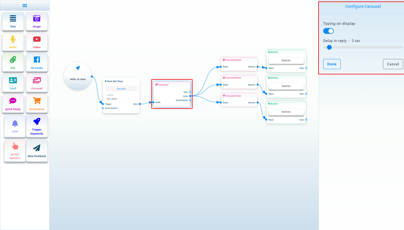 Now double-click on the Carousel component and the right sidebar called configure Carousel will appear. In the sidebar, you can enable typing on display and select delay in reply time in seconds. Now click on the Done button.