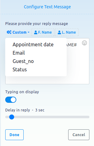 Besides, you can include custom variables in the reply message. Click on the button called custom and a drop-down menu of different variables will appear. And from the drop-down menu, select a variable. The custom variable will be replaced by the actual value before sending it.