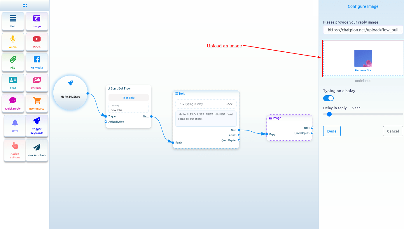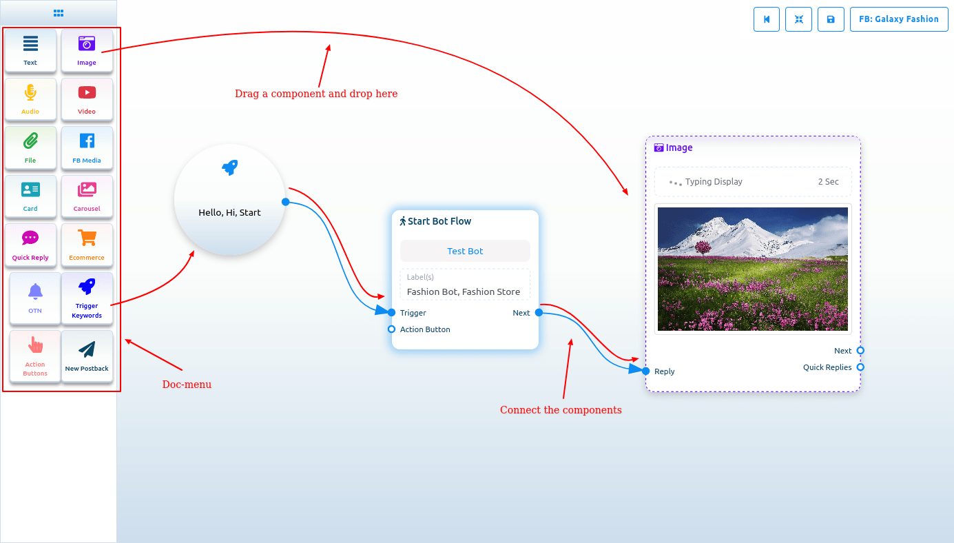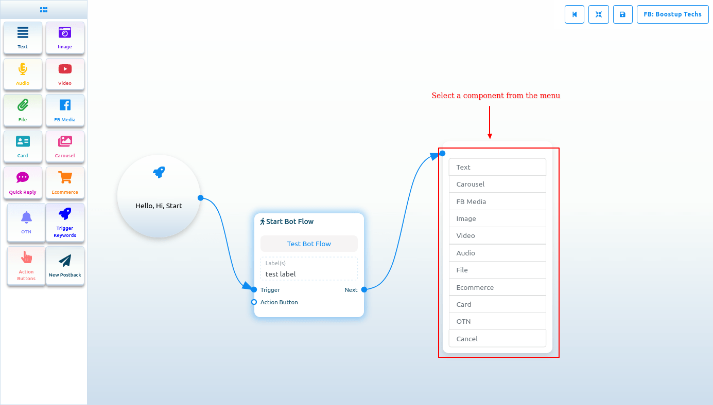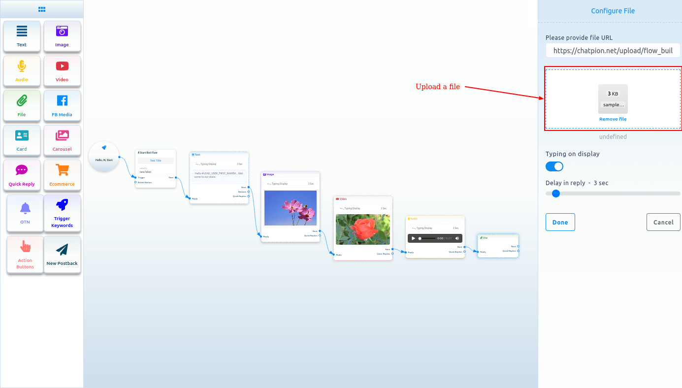 Likewise, you can add Image, Audio, Video, and File components. For these components, you have to upload an image, audio, video, and file respectively. Then you have to connect the components with other components.