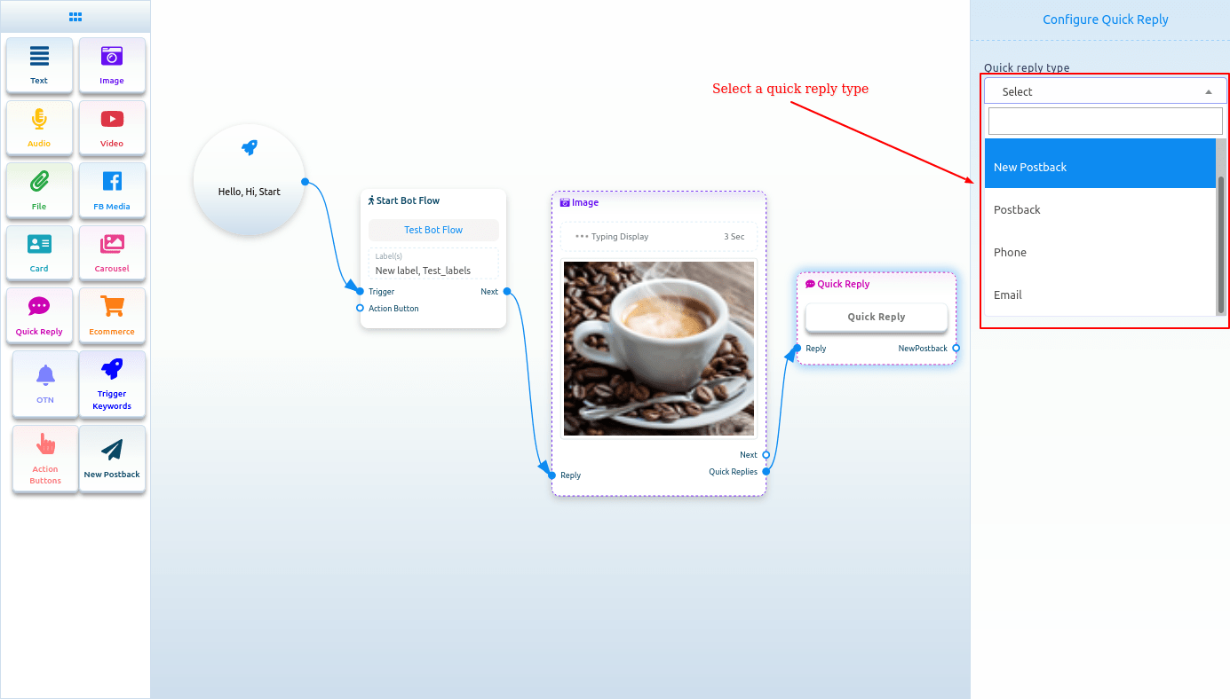 Now double-click on the Quick Reply component and a right sidebar called configure Quick Reply will appear. Now in the quick reply type field, you have to select a quick reply type. Click on the quick reply type field and a drop-down menu of different types of quick replies – New postback, Postback, Phone, and Email – will appear.