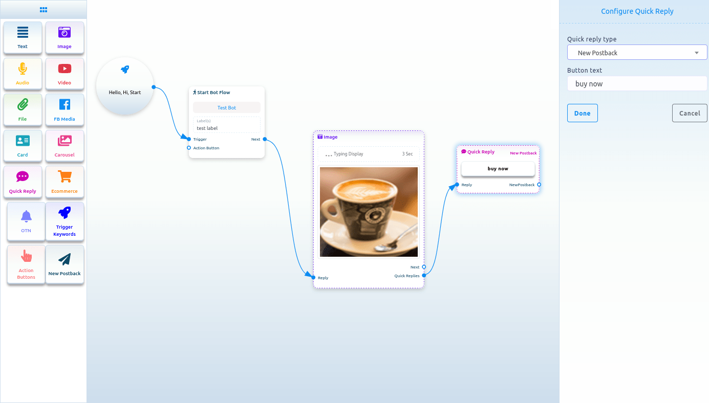 Select new postback as the quick reply type, and instantly a field called button text will appear. Now you have to provide a text for the button in the button text field. Then Click on the done button.