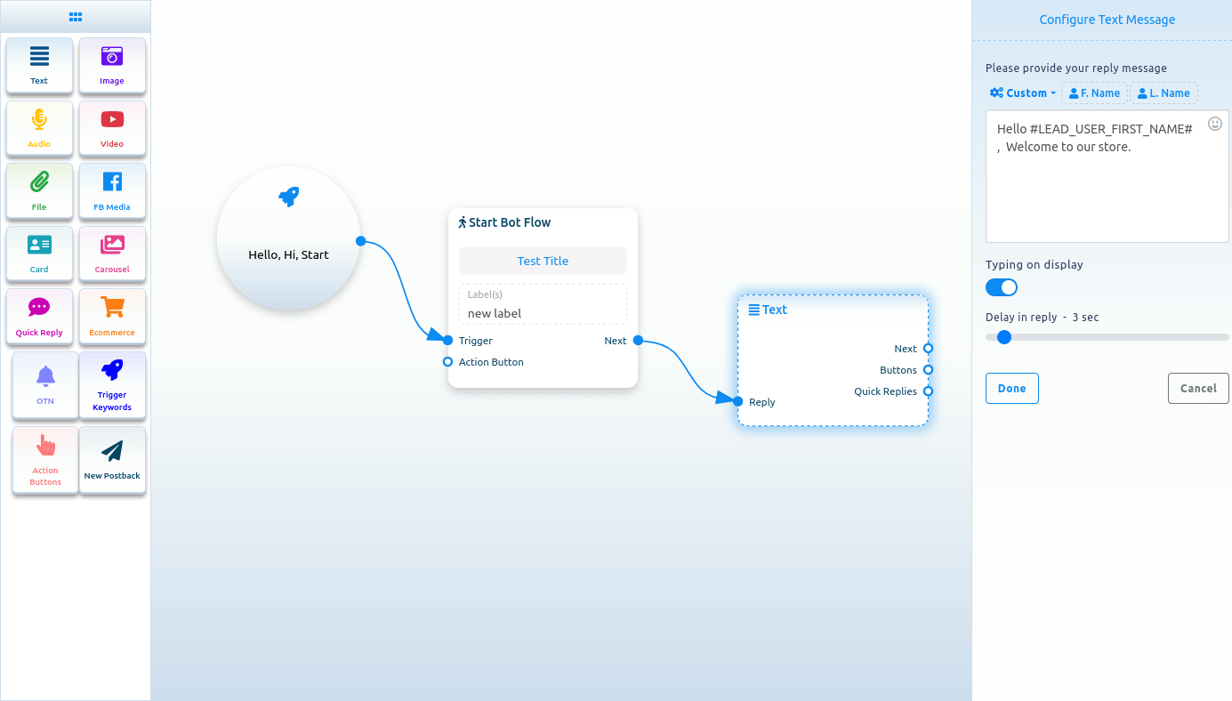 Now click on the Done button and the information will appear on the component. Then connect the text component with the Start bot flow component.
