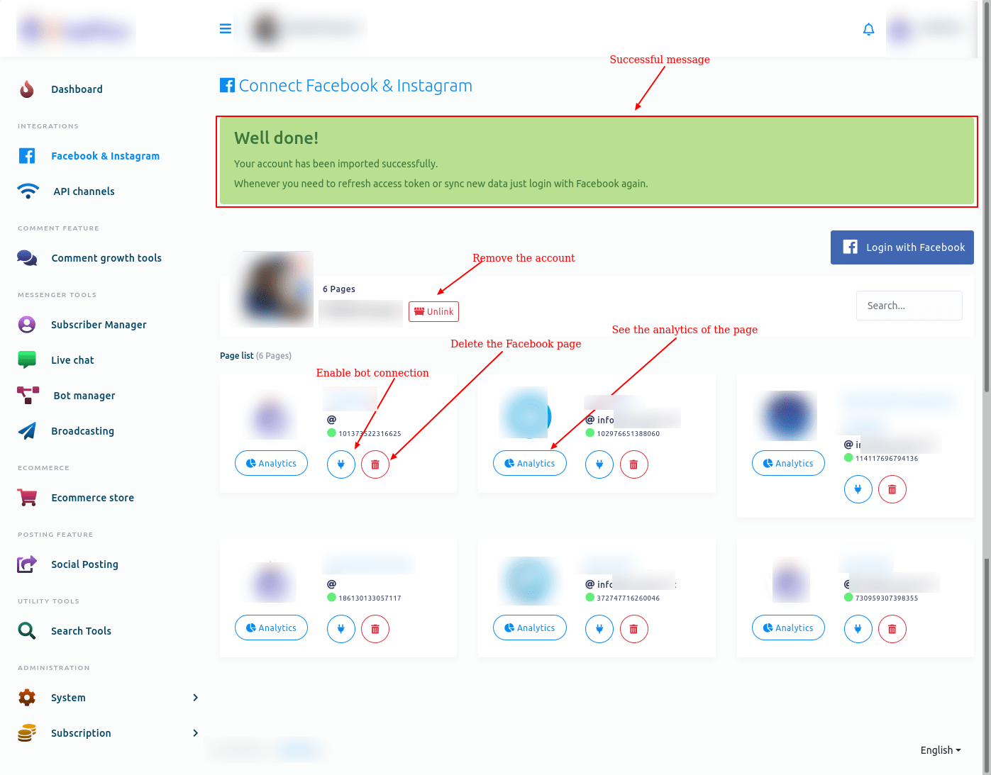 Instantly, the Connect Facebook and Instagram page will appear with a successful message and Facebook profile and Facebook page. Under the Facebook pages, you will see two buttons — the plug button and the delete button.