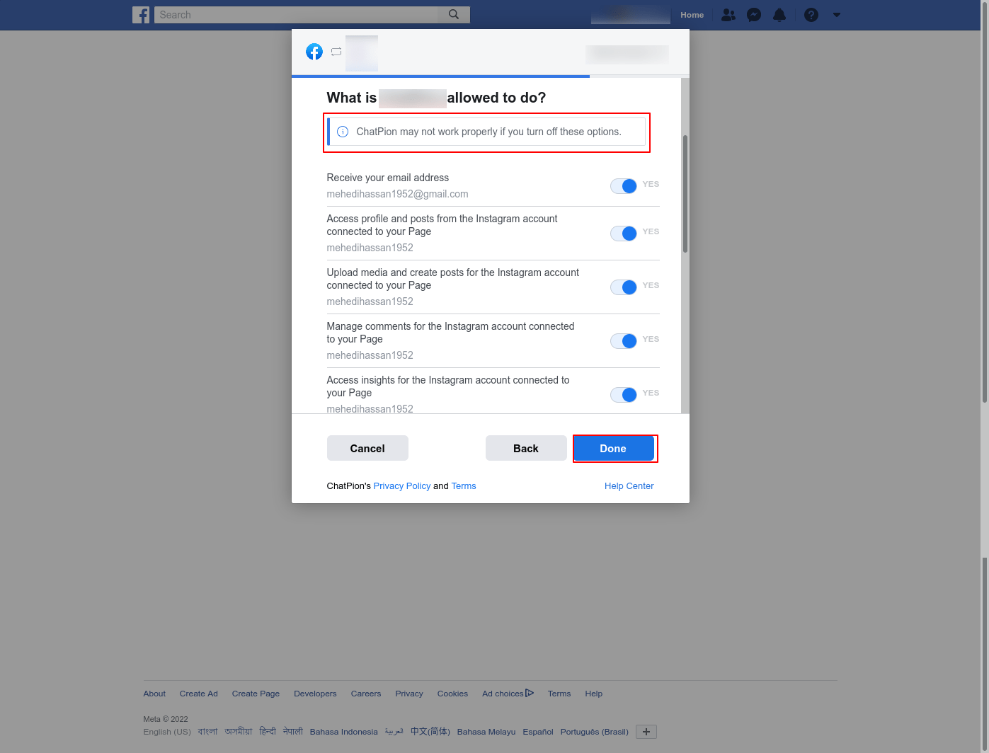 On the modal form, you have to select Instagram business accounts you want to use with ChatPion. Of course, you can select multiple or all Instagram business accounts.