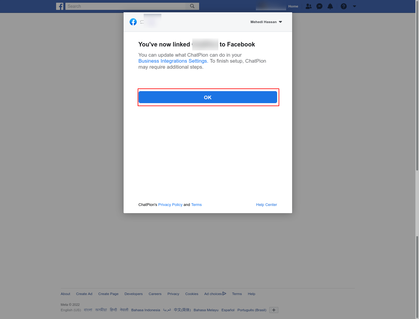 Instantly, another modal form will appear with a message that now you have linked ChatPion to Facebook and the Ok button.